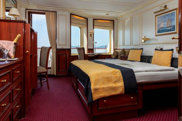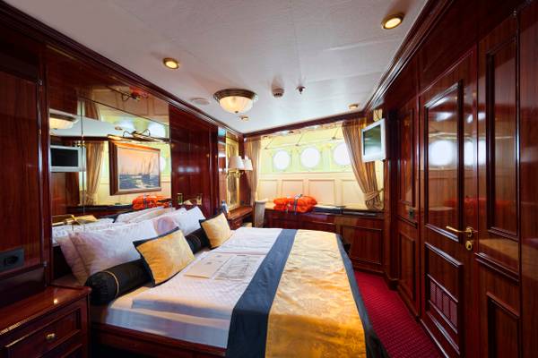 Die Kabinen der Royal Clipper sind komfortabel und hochwertig ausgestattet, viele davon mit besonderem Raumgefühl für ein Segelschiff. Sie bieten einen ruhigen Rückzugsort und verbinden klassischen Stil mit modernem Komfort.